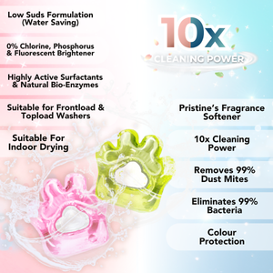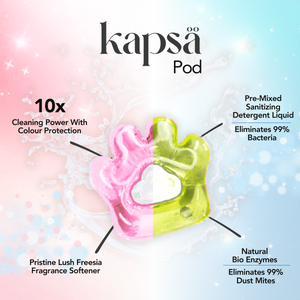 Kapsa's magic pods clean like magic. Eliminating 99% bacteria, stains and dust mites while protecting colours. Low suds formulation to save water & reduce residue that is skin sensitive.